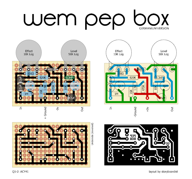 Here's a cool vintage fuzz circuit from the mid 60s–the WEM Pep Box. It's probably best known its use by John Lennon during the Revolver sessions. There are two versions of this effect, the first using germanium transistors and the later using silicon. I've drawn up layouts for both iterations of the circuit, as there are slight variations between the two. The originals used a 500k Level pot with a 56k resistor in parallel. This equates to a 50k pot, so the layouts reflect that. Also, if the effect is to thick for your tastes, try reducing the 2 electro caps down to 10µ. It seems both values were used.