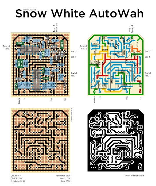 By popular demand, I give you the Mad Professor Snow White AutoWah. Now stop pestering me for it. ;) This was a pretty complicated circuit to fit on a single-sided board, so there are a few jumpers (one of which is super long–bugs me, but it was the only way to make it work), but if you play your cards right you should be able to squeeze it into a 1590B like the original.