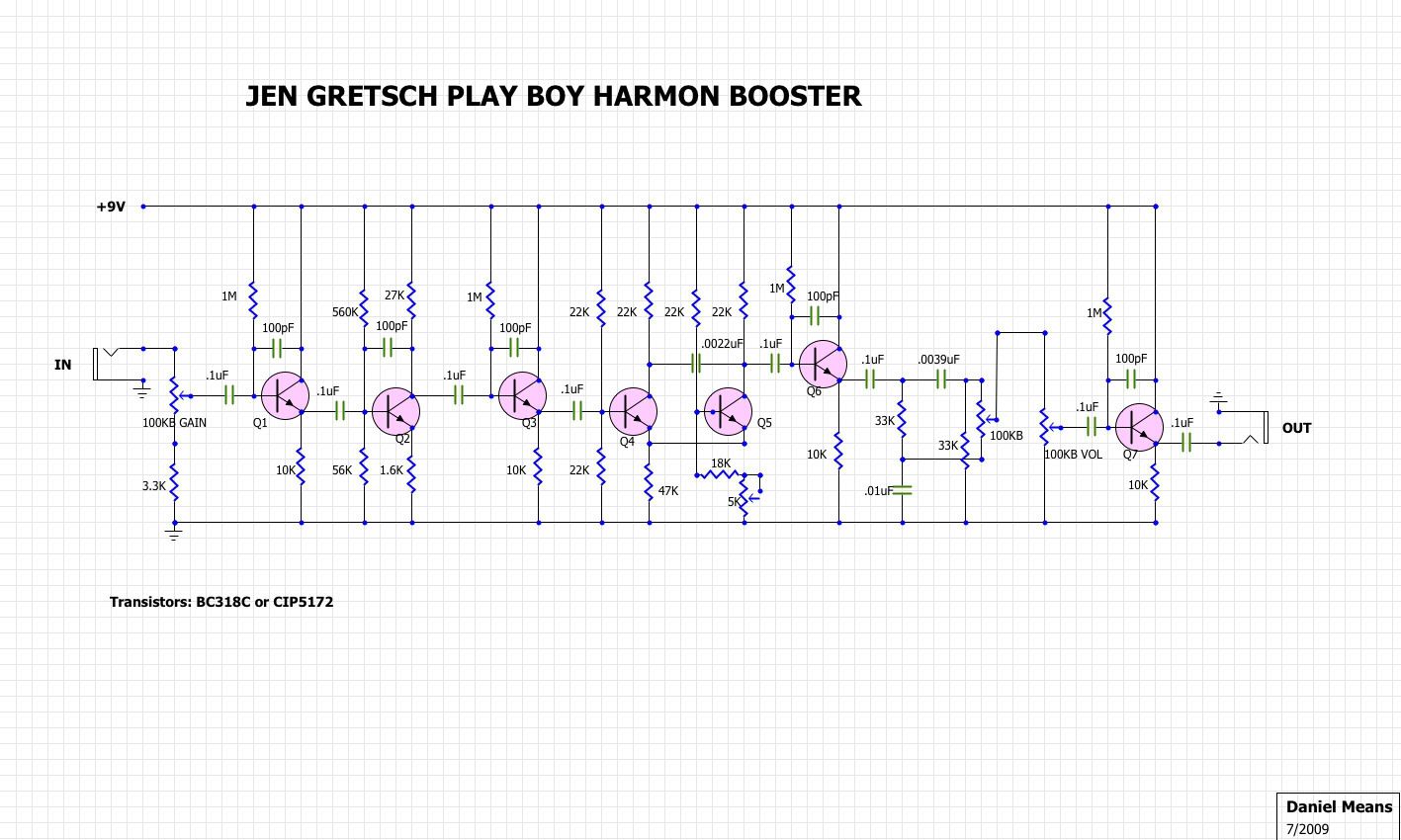 The Heavy Darling is a SIMPLE fuzztone that cleans up great, has old school character, and good sustain...pretty much ANYONE who can solder should be able to build this one. It uses a MPSA13 Darlington transistor in the 1st stage that pushes the 2N3904 into full saturation. The 220k resistor limits the amount of saturation, and you could certainly experiment with values here. A pot could also be used to give some variable gain, and you could even set up the pot in a similar manner to the Orpheum, Fuzzrite, and Shin-Ei style fuzzes.
